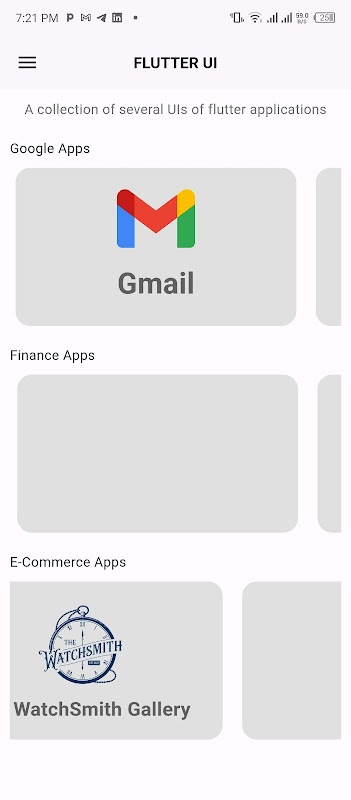 Mempamerkan pelbagai UI aplikasi popular yang dibina dengan Flutter untuk memberi inspirasi kepada pembangun.