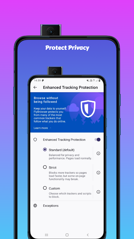 Fly Browser bukan sahaja menyekat iklan tetapi juga melindungi privasi anda. Dengan perlindungan terhadap penjejak dalam talian, apl membantu memastikan data peribadi anda selamat dan terjamin.