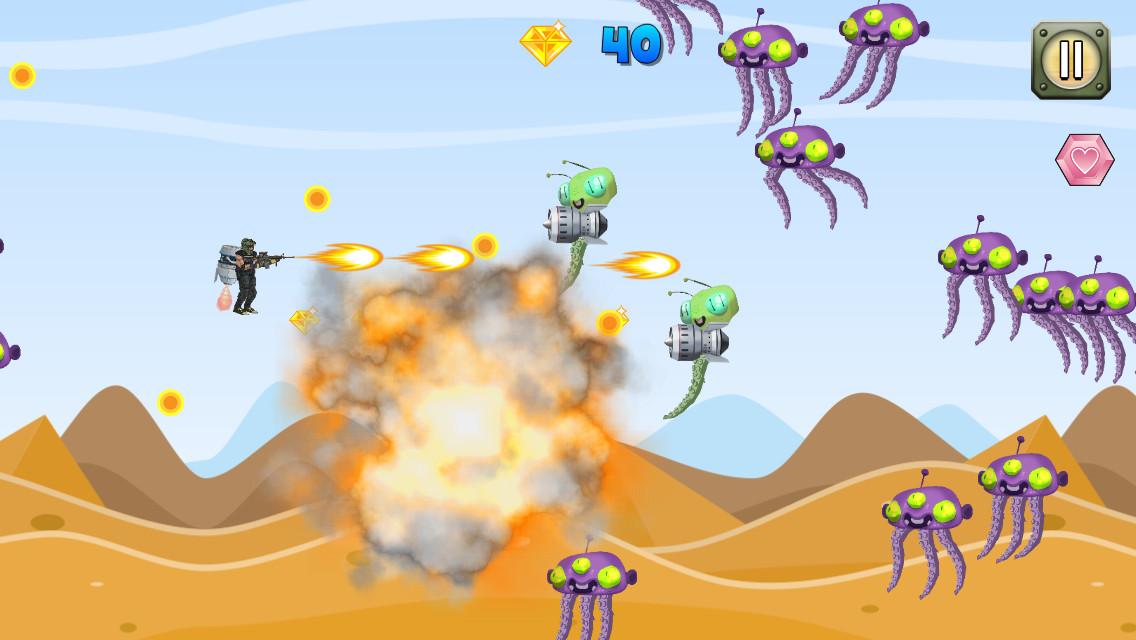 An elite commando wearing a jetpack fights aliens in a bid to take over their space ship in a deadly battle pitting human modern weapons against alien weaponry. Enter their space ship fortress to counter strike enemy sentries and the brain boss. Collect the diamonds. Aim for high score.