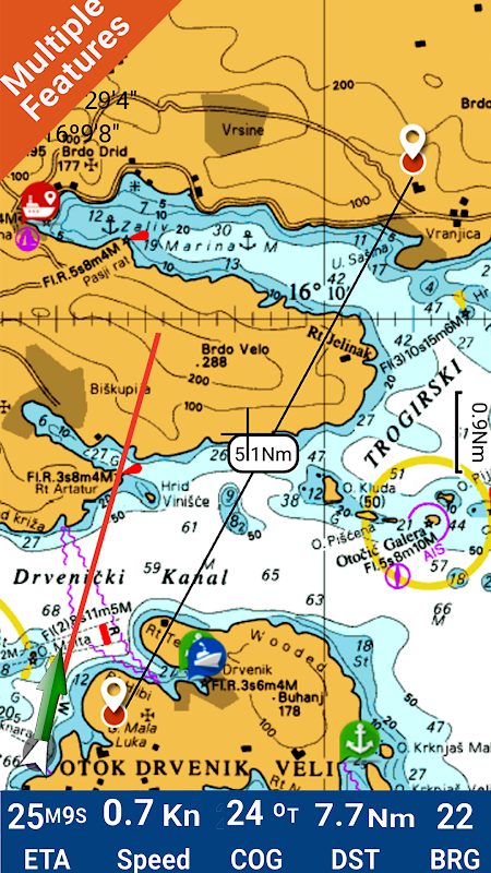 Pilih mana-mana sasaran untuk melihat butiran kapal seperti nama, MMSI, IMO, tanda panggilan, status, kelajuan, tajuk, koordinat, jarak dari lokasi GPS anda & banyak lagi.