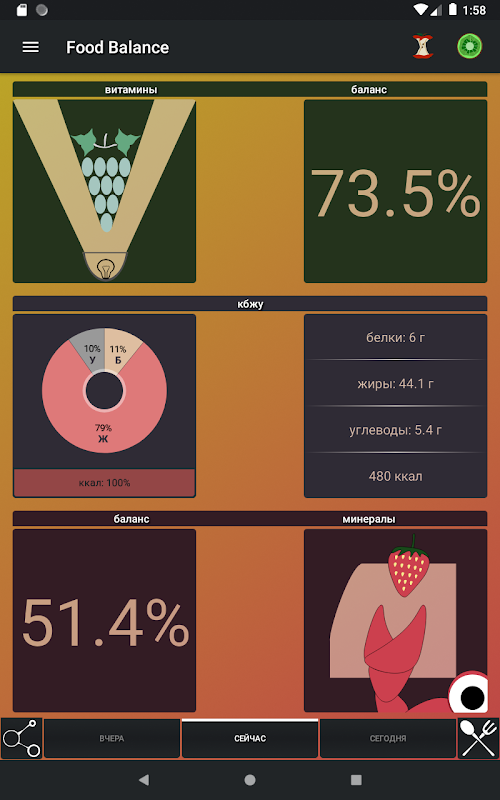 - Mod SEKARANG - menunjukkan keseimbangan vitamin, mineral, KBJU dalam masa nyata, untuk bahagian masa lalu hari ini;