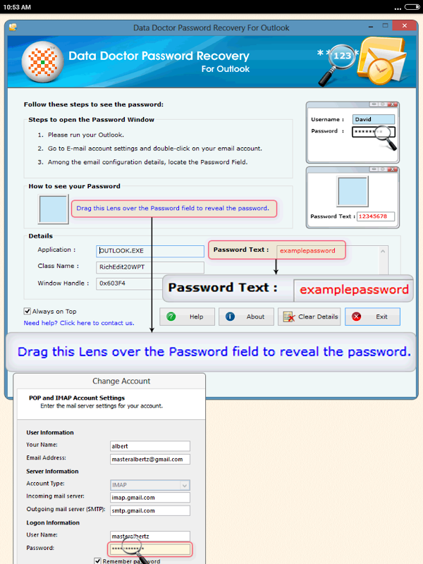 Aplikasi ini menasihatkan kata laluan membuka kedok & Mendedahkan langkah-langkah untuk menukar kata laluan yang tersembunyi di sebalik tanda bintang atau titik menggunakan masing Data Doctor Password Recovery Software for Windows. Data Doktor Password Recovery Software mendedahkan kata laluan yang disimpan semua jenis e-mel dikonfigurasikan dalam semua jenis email semua jenis laman web serta perkhidmatan e-mel popular seperti Gmail hotmail berlainan yahoo AOL dan lain-lain tetapan POP3 SMTP atau IMAP berdasarkan kira anda telah mengkonfigurasi melalui SSL TSL atau tetapan pengesahan standard.