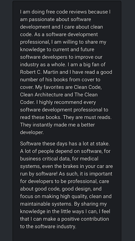 I am doing free code reviews because I am passionate about software development and I care about clean code. As a software development professional, I am willing to share my knowledge to current and future software developers to improve our industry as a whole. I am a big fan of Robert C. Martin and I have read a good number of his books from cover to cover. My favorites are Clean Code, Clean Architecture and The Clean Coder. I highly recommend every software development professional to read these books. They are must reads. They instantly made me a better developer.