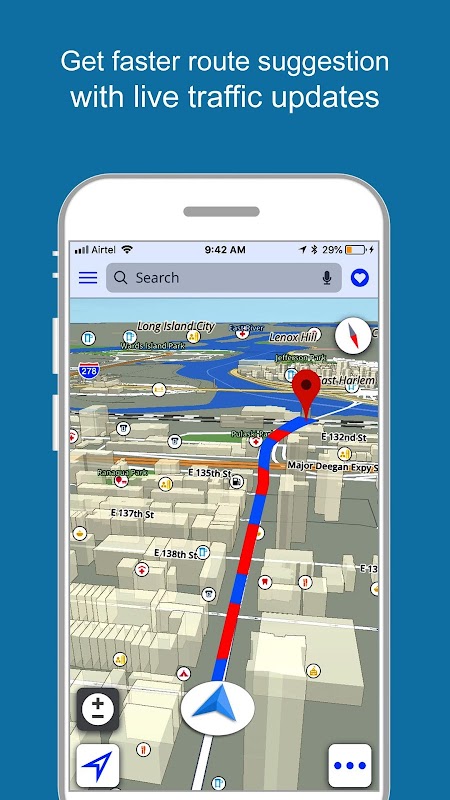 Traffic Alerts option in Free GPS, Maps, Navigation & Directions app will help you to give you the live traffic status around your location. Based on the information of Traffic you can easily plan your travel needs. Live Traffic will help you to calculate the journey time between your current location and destination.