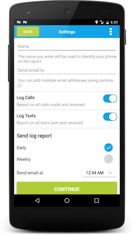 Each day the app sends you a list of calls made and texts exchanged from the phone to your email. Configure the time of email as needed.