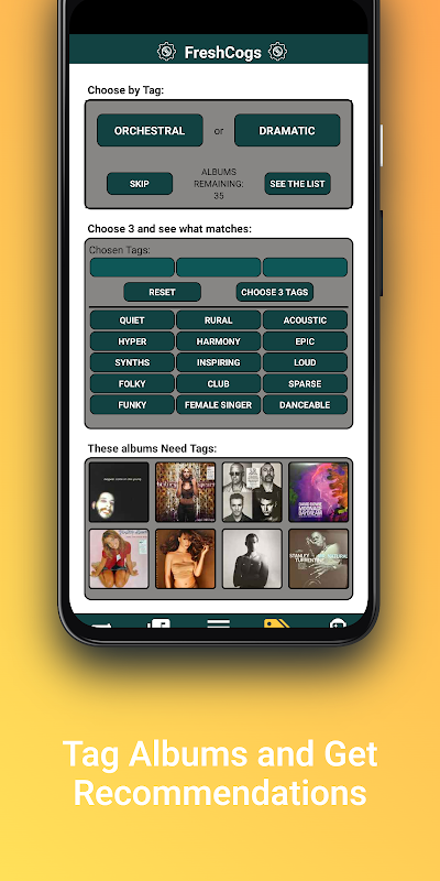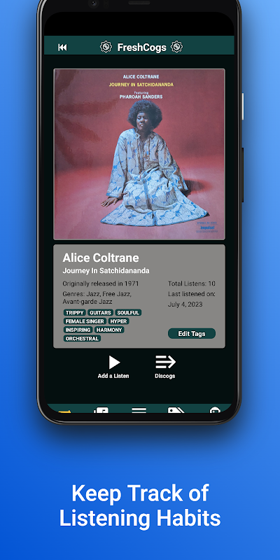 FreshCogs ialah cara terbaik untuk menjejak vinil yang anda dengar, menyemak imbas koleksi anda dan mengkategorikan album berdasarkan teg pilihan anda. Hanya sambungkan FreshCogs ke akaun Discogs rasmi anda untuk membolehkan akses segera kepada koleksi vinil anda.