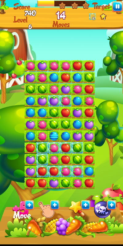 ✔ Match 3 same fruits to collect the candies and to complete each level. Match 4, 5 same times and other cross same fruits to get special booster fruits.