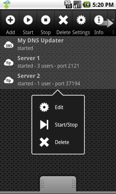 - For every FTP Server you can set name, port, only access from certain IP addresses, vibrate on a new connection, enable logging, only log errors, start the server when connected to a specific WIFI network and disconnect when the WIFI network is lost, or start on boot, respawn on crash, enable SSL