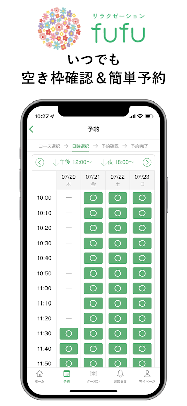Anda boleh menerima maklumat terkini dan tawaran [Relaxation fufu] melalui apl. Selain itu, anda boleh menyemak menu dan slot masa yang dikehendaki serta membuat tempahan dari telefon pintar anda pada bila-bila masa. Dengan memasang apl, anda boleh menggunakan [Relaxation fufu] dengan lebih mudah.