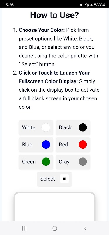 Temui alat yang sesuai untuk peminat fotografi yang mencari skrin biasa, individu yang ingin menerangi bilik mereka dengan warna tertentu atau sesiapa sahaja yang memerlukan kertas dinding sementara untuk peranti mereka. Apl Skrin Kosong Penuh juga merupakan penyelesaian praktikal bagi mereka yang bertujuan untuk membersihkan skrin mereka, menguji piksel mati atau menilai kualiti cahaya paparan dengan skrin kosong. Kesederhanaan dan fungsinya menjadikannya sebagai alat penting dalam kit alat digital anda. Pilih skrin kosong putih bersih untuk estetik yang bersih dan minimalis, atau pilih skrin serba hitam untuk menjimatkan hayat bateri sambil mengekalkan rupa yang bergaya.