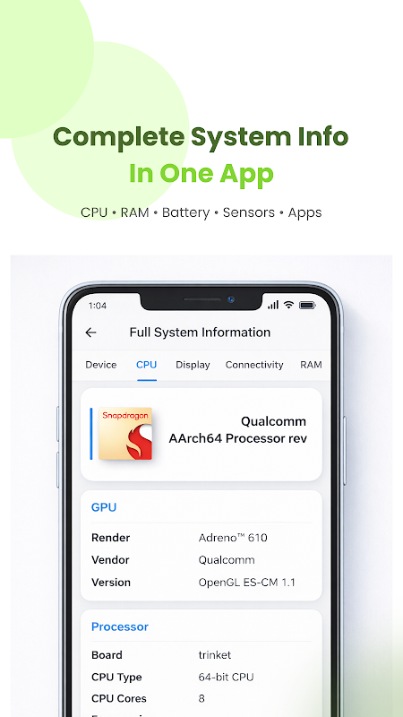 Maklumat sistem memberi anda maklumat perkakasan dan perisian anda seperti CPU, GPU, versi os mudah alih android dan juga memberikan maklumat memori dan maklumat paparan peranti anda.