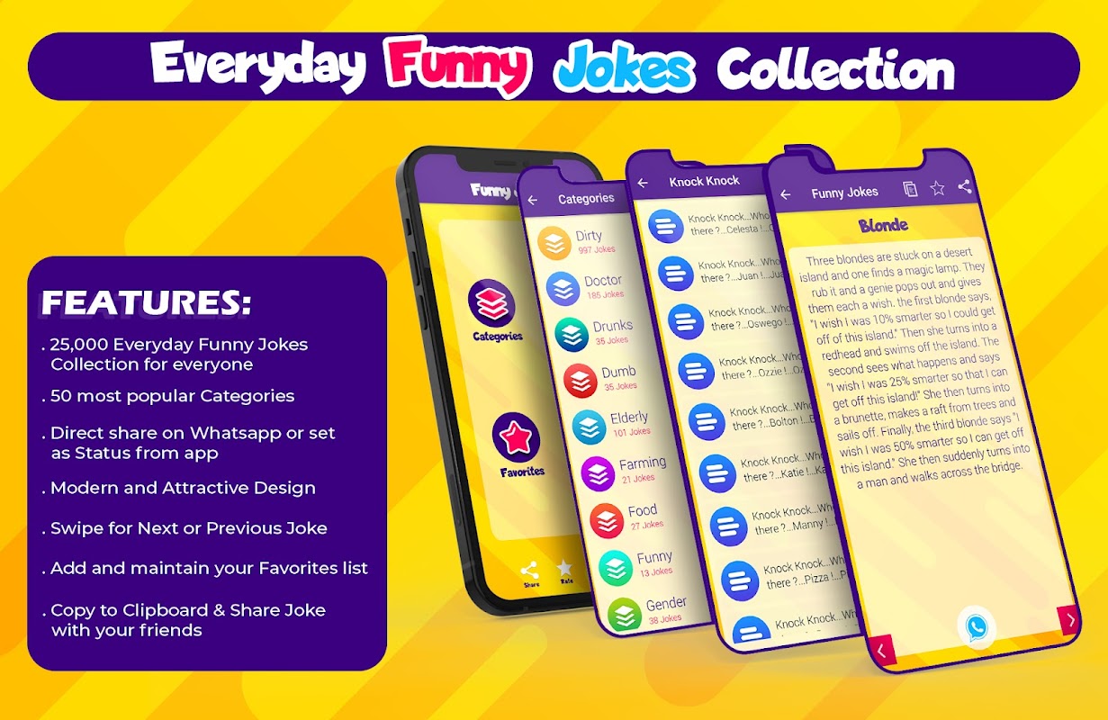 Koleksi Jenaka Lucu ialah satu aplikasi jenaka terbaik untuk anda ketawa setiap hari. Ia adalah aplikasi terbaik untuk berkongsi jenaka lucu dengan rakan dan keluarga anda melalui 25,000 jenaka yang disusun dalam 50 kategori berbeza.