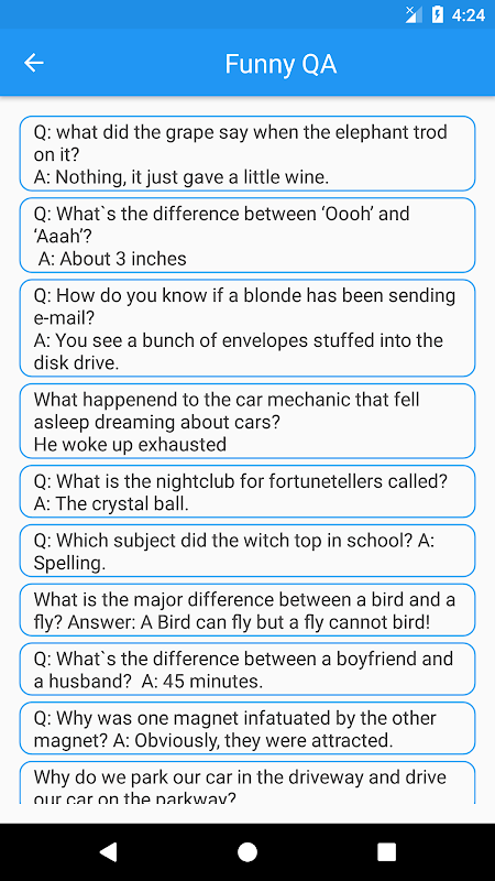 Funny Q&A 2018 (Funny Questions and Answers) app is finally here. It is an easy to use, practical, and funny app for your smart mobile phone. If you need something to cheer you up, simply install this crazy fun questions and answers application for free. Let’s put a smile on that face!