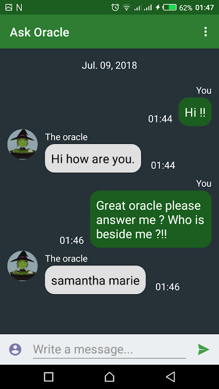 The secret of witch chat is simple , you connect with the witch in a chat room , the witch is automated to replay randomly , when you write any common words , for example if you send a message with Hi , Hello , the oracle will reply hello, How are you ! But wait !! how to fool your boyfriend over witch chat ?