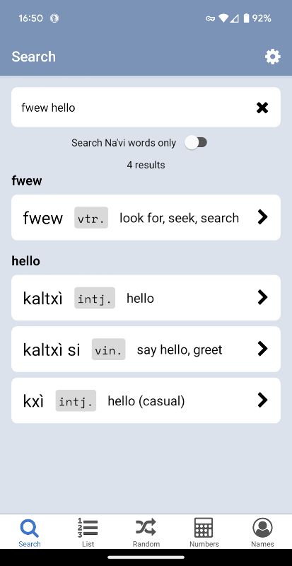 Aplikasi carian kamus bahasa Na'vi berbilang bahasa yang berkuasa