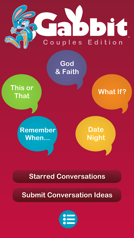 Make your relationship stronger with Gabbit! It gives couples fun, meaningful conversations and activities on dates, at mealtimes, in the car, at bedtime, and anywhere you're together. The Gabbit Couples edition includes hundreds of fascinating questions for you and your partner to grow closer to each other. It comes with 5 categories: Date Night, Remember When..., This or That?, What If?, and God & Faith.