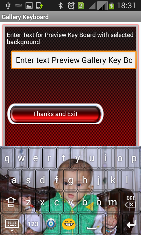 Gallery Keyboard adalah imej yang menakjubkan dan indah Galeri papan utama untuk anda android device.Now anda boleh menggantikan keyboard galeri dengan papan kekunci lama dengan menggunakan ini anda boleh menetapkan tersayang satu gambar yang anda sebagai background.Feels keyboard baik semasa menaip papan utama dengan background.you menakjubkan boleh menukar papan kekunci mudah untuk modal yang> kecil> nombor dan characters- khas> huruf besar dan juga kunci emoji keyboard.