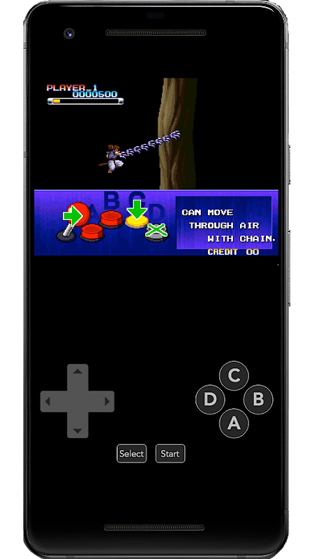 Controlling the characters is done with a joystick, which moves them left and right. Attacking enemies is performed by pressing the A button, while B makes the character jump and C activates a grappling hook that allow players to pull forward, swing onto the latched object as well as attack enemies at a distance. Players can also perform a jump kick move with the B button that not only attack enemies, but allows their character to climb walls. By holding A, players can unleash a powerful attack against enemies after charging, however, it leaves them exposed to enemy attack.