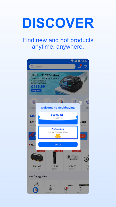 Membeli-belah dalam talian dengan Geekbuying adalah sangat mudah kerana anda boleh membeli-belah dari keselesaan rumah anda dan mendapatkan produk dihantar di depan pintu anda. Dengan memuat turun apl beli-belah dalam talian Geekbuying pada telefon atau tablet Android anda, anda boleh menyemak imbas koleksi besar kami lebih daripada 20,000 produk daripada pelbagai kategori termasuk pencetak 3D, pengukir laser, E-Bikes, produk rumah pintar dan banyak lagi dengan mudah.
