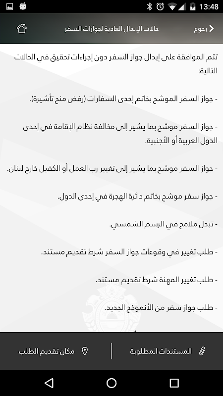 2- All types of applications that can be submitted to the GDGS are listed . Also, the supporting documents required for each type of applications are detailed. This App offers the user the possibility to make a checklist document for his future General Security applications in order to make sure he has not missed any supporting document.
