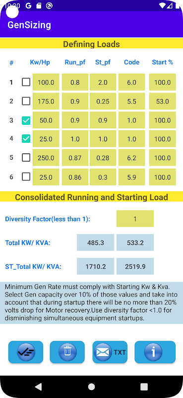 Oleh kerana motor tidak dihidupkan serentak, pilih faktor kepelbagaian yang sesuai(<=1.0) untuk mengira penarafan beban yang sesuai diambil sebagai asas untuk memilih kuasa Penjana. Sentiasa merujuk kepada Katalog Pengeluar pengeluar untuk memilih penjana.
