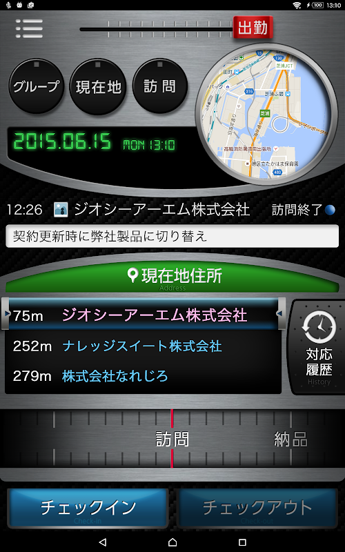 Sebaik sahaja anda memahami lokasi semasa anda menggunakan GPS, senarai pelanggan yang berada di sekitar dipaparkan dengan menekan mudah pada skrin. Ini "perkhidmatan concierge" panduan kepada anda untuk pelanggan anda dan membolehkan anda menggunakan masa lapang anda produktif. Terdapat juga fungsi untuk berkongsi rekod lawatan lalu, membolehkan anda untuk membuat sebahagian besar peluang perniagaan anda.