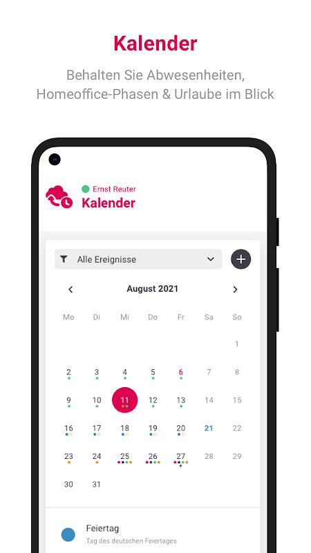 Einfacher geht es nicht: Abwesenheiten, Urlaubs- oder Homeofficetage werden übersichtlich im Kalender abgebildet. Außerdem können Sie aus dem Kalender heraus weitere Anträge stellen. Ihre aktuellen Salden können Sie zu jeder Zeit in der Stempeluhr App einsehen.