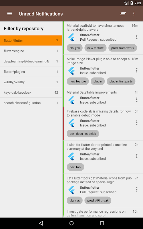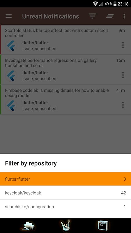 Aplikasi secara berkala menyemak pelayan GitHub untuk pemberitahuan baharu dan melancarkan pemberitahuan Android dengan bunyi dan getaran yang boleh dikonfigurasikan untuk memaklumkan anda. Anda boleh menunjukkan senarai pemberitahuan GitHub yang belum dibaca, menapisnya mengikut repositori, menandai satu atau semua pemberitahuan sebagai dibaca, meredamkan urutan pemberitahuan yang dipilih atau melihat maklumat terperinci tentang acara diberitahu. Anda juga boleh menunjukkan senarai repositori yang ditonton, tetapkan penapis untuk jenis pemberitahuan yang ingin anda maklumkan, nyahlihatnya atau melihat maklumat terperinci. Maklumat terperinci ditunjukkan oleh web GitHub (yang mesra mudah alih) atau menggunakan aplikasi android GitHub rasmi, jadi anda melihat semua butiran yang diperlukan dan melakukan tindakan yang berbeza (cth. balasan dalam perbincangan dll.) secara langsung.