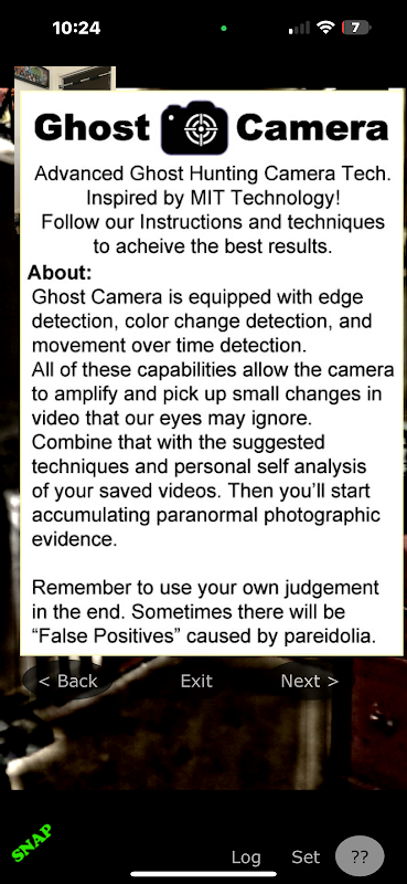 Cuba pada telefon anda, tangkap bukti anda sendiri dan tentukan sendiri. Ghost Camera ialah teknologi imej kamera termaju. Ia bukan mainan atau permainan. Ghost Camera membolehkan pengguna menangkap secara digital hantu dan corak cahaya paranormal lain dalam persekitaran sekeliling mereka. Serupa dengan kamera terma, Ghost Camera menangkap perubahan cahaya kecil yang tidak kelihatan dan menguatkan perubahan itu supaya pengguna dapat melihat dan menganalisis persekitaran paranormal mereka dengan cara baharu.