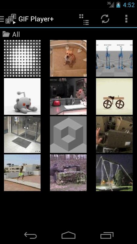 Memaparkan senarai fail GIF yang disimpan pada peranti anda dan memainkannya serta-merta selepas pemilihan.