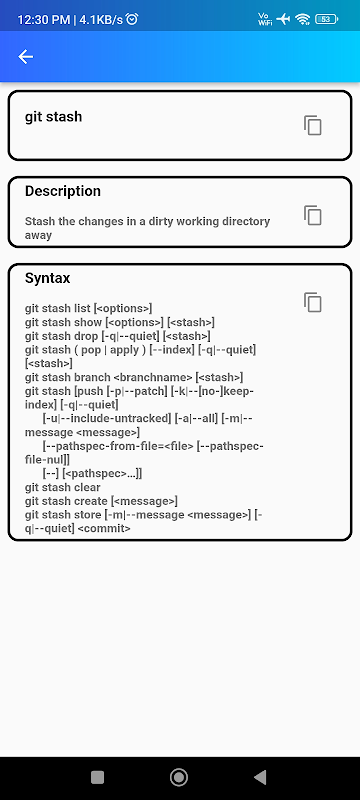 Apl ini direka untuk membantu Pembangun dan pelajar kejuruteraan mempelajari arahan yang mereka perlukan dengan cepat dan mudah. Ia termasuk perpustakaan komprehensif lebih daripada 200 arahan Git yang biasa digunakan, disusun mengikut kategori untuk navigasi mudah. Selain itu, setiap arahan mempunyai penerangan terperincinya sendiri supaya anda boleh memahami dengan lebih baik cara ia berfungsi sebelum menggunakannya sendiri.