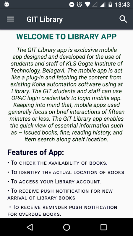 Aplikasi Perpustakaan GIT adalah aplikasi mudah alih eksklusif yang direka dan dibangunkan untuk kegunaan pelajar dan kakitangan KLS Gogte Institute of Technology, Belagavi. Aplikasi mudah alih adalah bertindak seperti plug-in dan semasa mengambil kandungan dari perisian Koha automasi menggunakan di Perpustakaan sedia ada. Pelajar-pelajar GIT dan kakitangan boleh menggunakan OPAC butiran log masuk untuk melog masuk aplikasi mudah alih. Menyimpan ke dalam fikiran itu, aplikasi mudah alih yang digunakan umumnya menumpukan kepada interaksi ringkas lima belas minit atau kurang. Aplikasi Perpustakaan GIT membolehkan pemandangan cepat maklumat penting seperti - rekod pinjaman, denda, sejarah membaca, dan pemeriksaan barang di sepanjang lokasi rak.