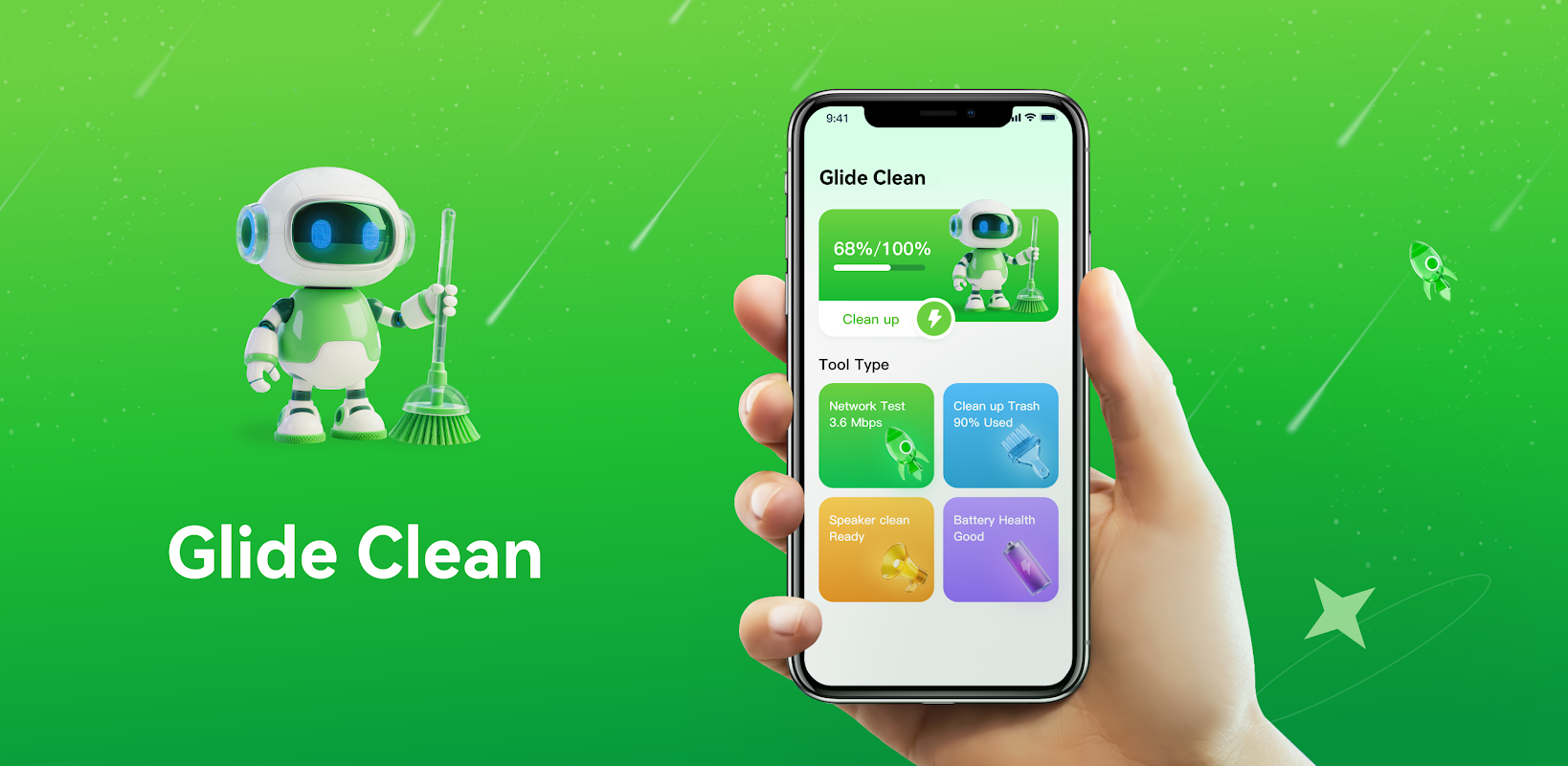 Glide Clean ialah alat pembersihan telefon yang cekap yang membantu anda mengosongkan cache dan fail sampah yang tidak berguna untuk mengosongkan ruang storan. Ia juga menawarkan pemantauan bateri, ujian kelajuan rangkaian dan ciri pembersihan pembesar suara untuk memastikan telefon anda berjalan pada tahap terbaik.