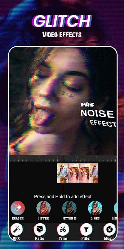 Editor Video Glitch, anda boleh memutarbelitkan video dengan cara yang terlalu artistik dengan mudah. Cukup ketuk, pilih salah satu dari pelbagai kesan gangguan Masa nyata dan tahan untuk menerapkannya dalam rakaman video. Selain itu, VHS unik yang unik, kesan gelombang wap 3d, penapis retro dan alat penyuntingan menjadikan klip anda semakin berkilau.