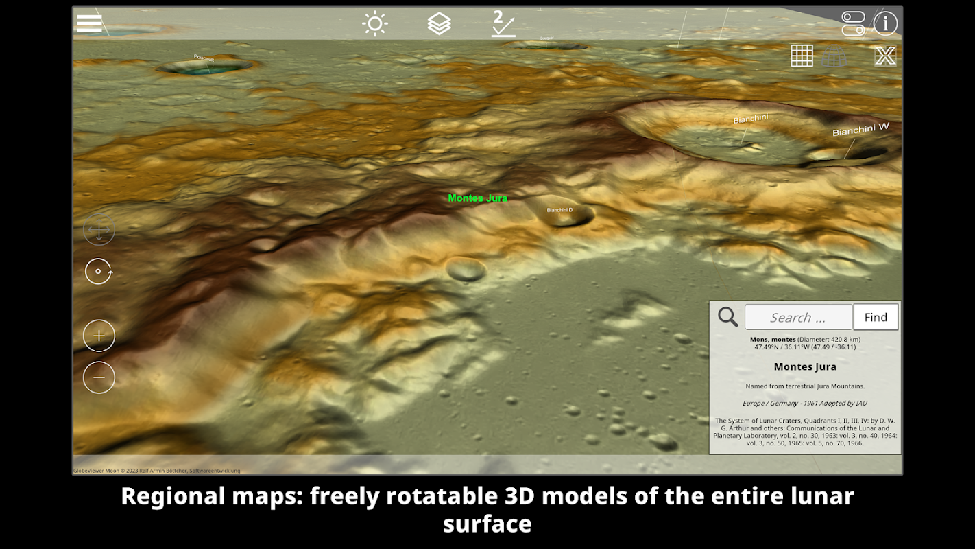 GlobeViewer Moon ialah perwakilan interaktif dan tiga dimensi bagi keseluruhan permukaan bulan. Pandangan putaran dunia memberikan gambaran keseluruhan semua sebutan sedia ada untuk pelbagai ciri permukaan. Jika anda berminat dengan kawasan tertentu, paparan peta 3D dengan resolusi yang lebih tinggi boleh dimuatkan untuk melihat dengan dekat kawah, alur dan ciri lain.
