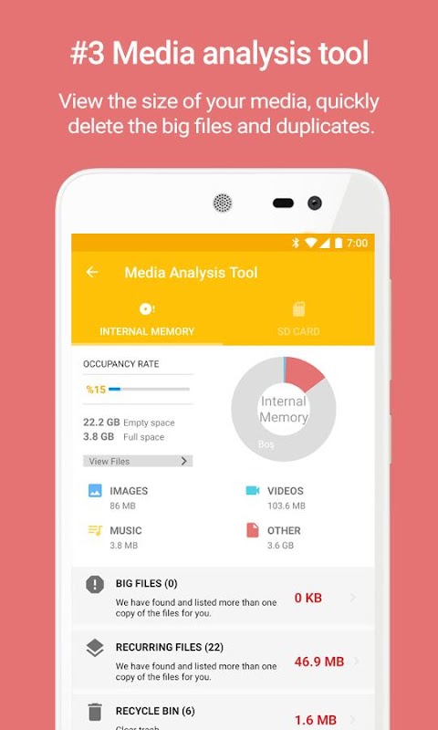 File Manager akan menganalisis memori internal dan kartu SD serta menemukan file besar, tidak penting, dan berulang untuk Anda.