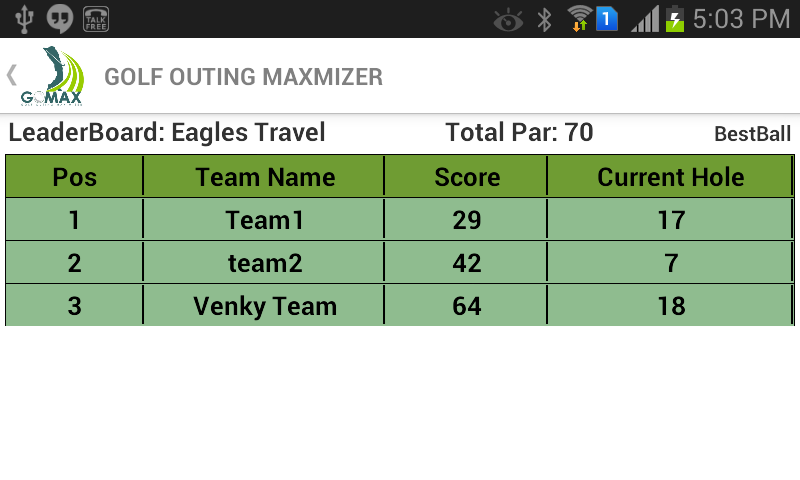 GoMax, Golf Outing Maximizer, is the best app available for charity and fund raising golf tournaments. This app makes the tournament more fun for the players and keeps them engaged. A live leaderboard shows the scores of individuals and or teams depending on the format of the tournament. Skill competitions like longest drive, straightest drive, closest to the pin and longest putt are available immediately on the live leaderboard.