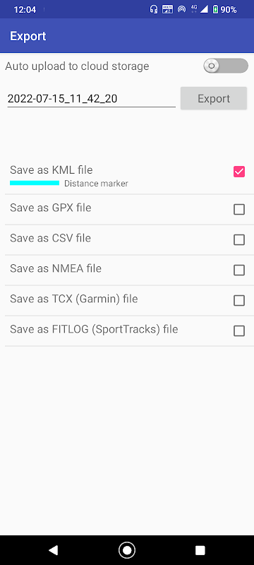 Tekan ikon "Simpan" untuk menyimpan data log ke fail KML, GPX, CSV