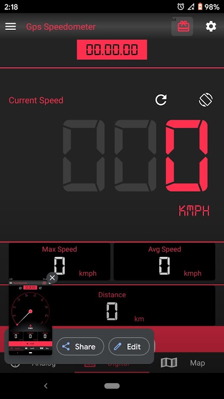 This App displays your current speed on a digital/analog speedometer, keeps track of your maximum speed and also calculates your average speed. It also allows you to easily switch between units of measurement (miles/hour or km/hour) for use in your vehicle (your cycle, your car, on a boat or on an airplane)!