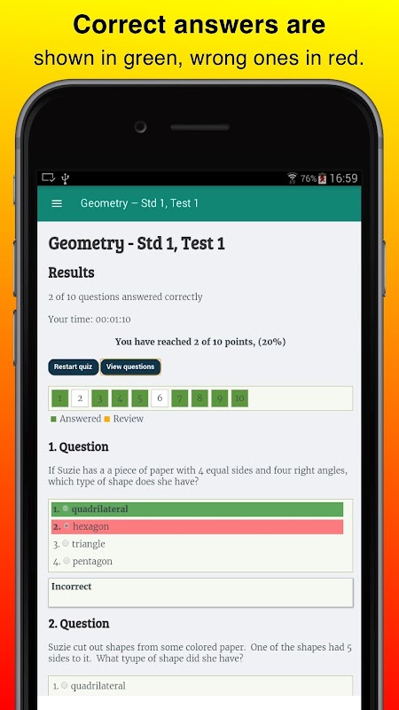 Correct answers are shown in green, wrong ones in red. When your answer was wrong the correct one is displayed. In some cases hints are given, that might be helpful for the future, just like the path you have to follow when solving mathematical tests.