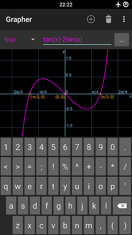Catatan : Fungsi matematik harus ditaip mengikut namanya, misalnya sqrt (x) bermaksud √x. Tahan kekunci untuk melihat semua nama fungsi bermula dengan huruf itu. Sekiranya ada sesuatu yang tidak jelas, pastikan anda melihat halaman 'Bantuan' kerana semua butirannya diringkaskan di sana.