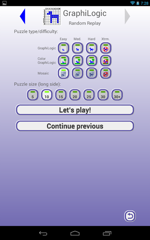 The game also supports Mosaic puzzles, also known as mosaik, Japanese mosaic, fill-a-pix, nurie or nampre.