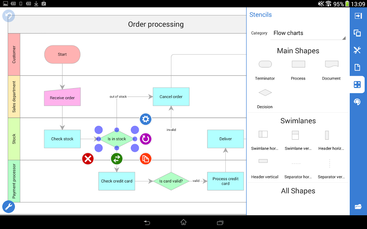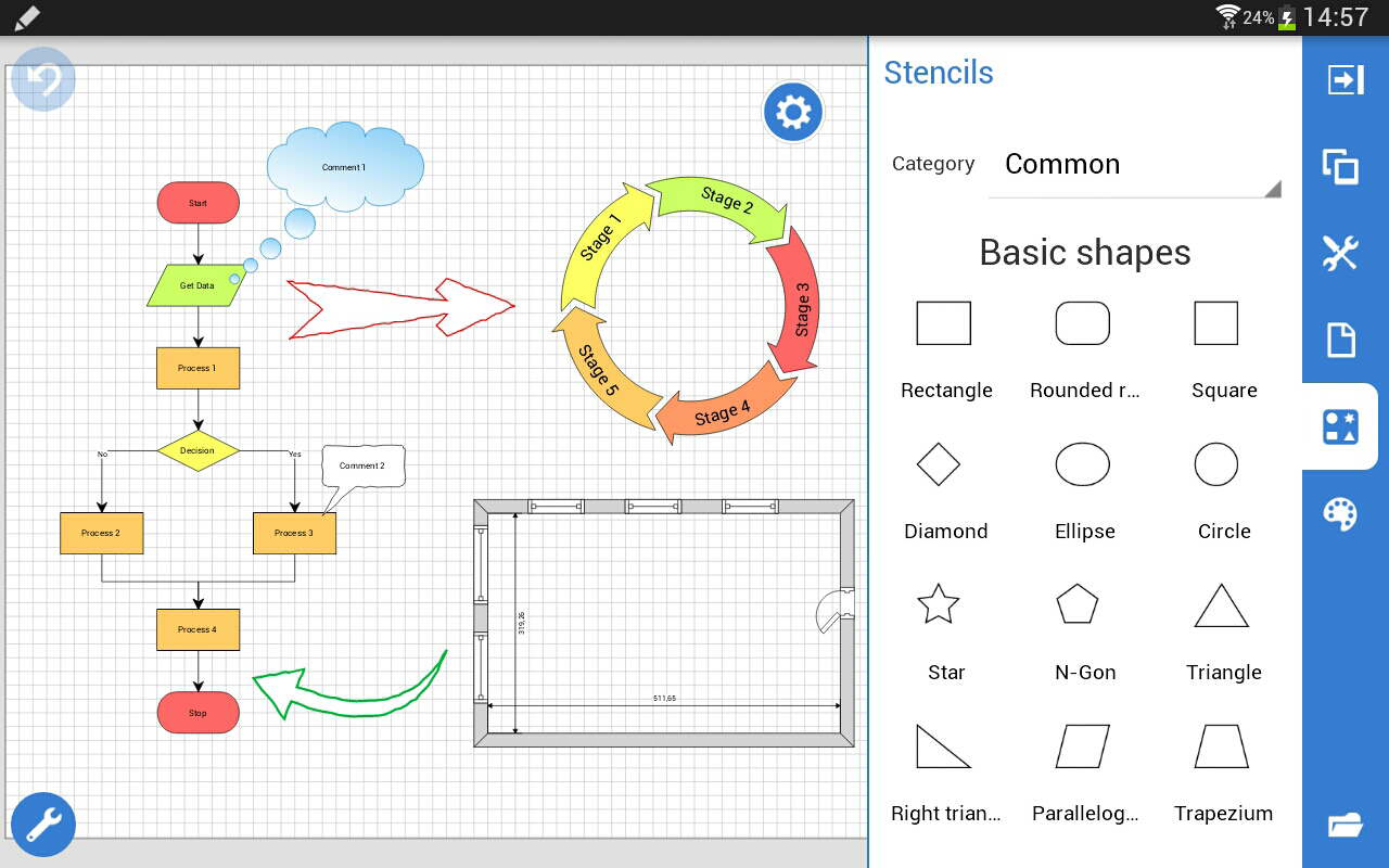 Despite the fact that app was designed with low-end tablet devices in mind it contains all features that can be expected from the mature state-of-the-art diagramming solutions like Visio: a rich set of built-in themes and styles,