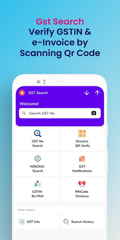 Apl Carian GST Percuma Membolehkan anda mencari GSTIN Mengikut Kamera , Cari GST mengikut Nama / Cari GST mengikut PAN / Imbas GSTIN untuk melihat butiran GSTIN.