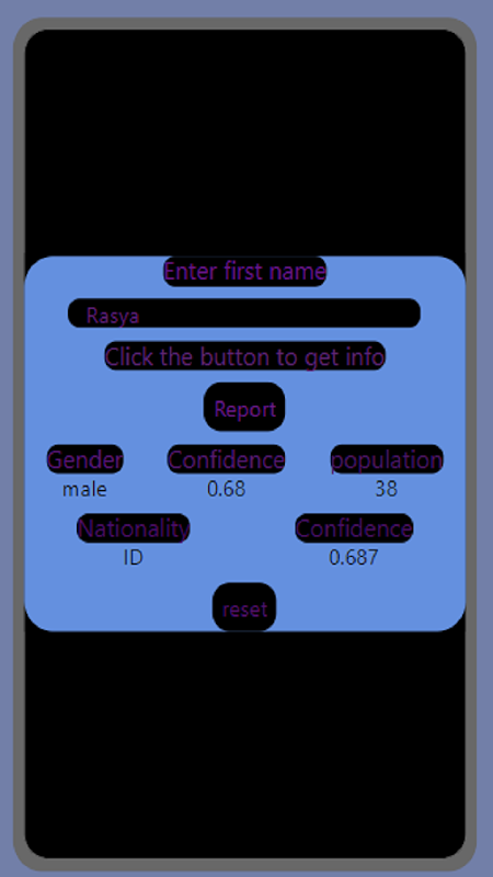 Aplikasi ini membolehkan anda menaip nama dan selepas anda mengklik butang laporan, aplikasi akan meneka kewarganegaraan dan jantina menggunakan keyakinannya.