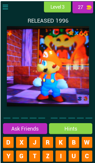 Write the name of the pictured game to complete a level. Do it as fast as you can and earn high scores and Guess the video game quiz coins. This video game knowledge is an interesting game that tests your knowledge about different games.By playing this amazing video game you can improve your memory in a fun way. Keep in mind this game is designed to the most hardcore players that have spreaded their gaming knowledge massively and are aware the latest trends in different types of games or like to play different types games. If this is not the case we recommend that you ask your friend using your coins. It is a good way to learn new titles and discover new games in common.