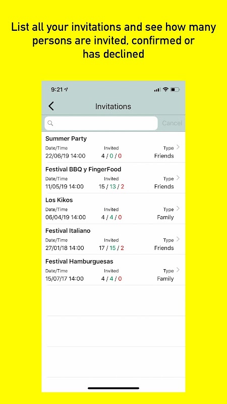 Dengan aplikasi ini, anda dapat dengan mudah menguruskan jemputan anda. Buat kursus / hidangan yang anda sediakan dan lampirkan orang ke acara anda. Tandakan setiap orang sebagai dijemput, disahkan atau ditolak.