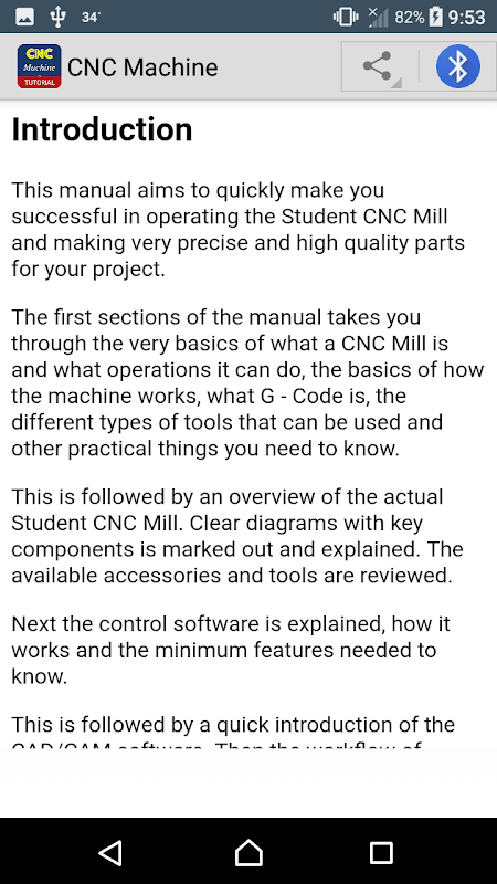 The manual takes you through the very basics of what a CNC Mill is and what operations it can do, the basics of how the machine works, what G - Code is, the different types of tools that can be used and other practical things you need to know.
