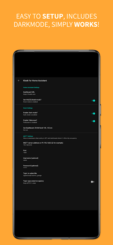 Apl kiosk ringkas, HAkiosk, memaparkan papan pemuka Home Assistant anda dalam skrin penuh. Ia boleh menyambung ke pelayan MQTT dan melanggan topik untuk mencetuskan penyelamat skrin atau pertukaran papan pemuka. Contohnya, ini boleh berlaku apabila lampu bilik menyala, atau apabila penghunian dikesan di dalam bilik oleh penderia gerakan.