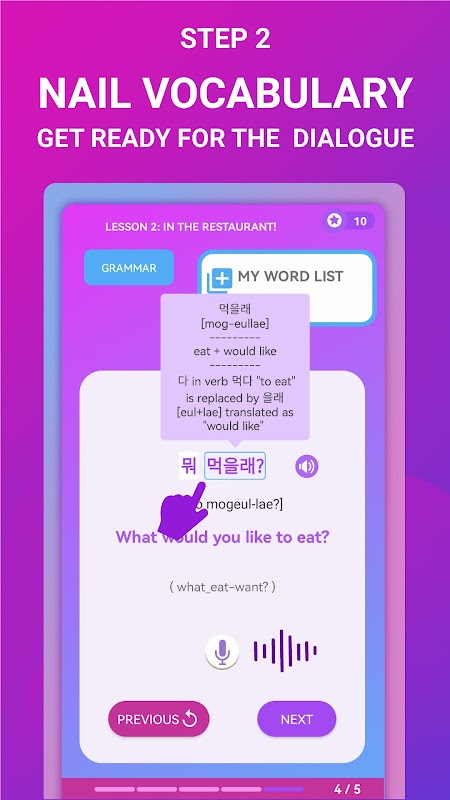 Anda akan belajar bahasa Korea dengan berkesan melalui latihan bertutur bahasa Korea. Tiada format pembelajaran pasif seperti kuiz, kad imbas atau teks sembang. Hanya mod pertuturan aktif. Hasilnya, anda bukan sahaja akan mempelajari tatabahasa dan perbendaharaan kata yang paling penting, tetapi juga memperoleh kemahiran komunikasi yang mantap dalam bahasa Korea dalam masa beberapa bulan. Kursus ini sesuai untuk pelajar peringkat permulaan dan juga pertengahan